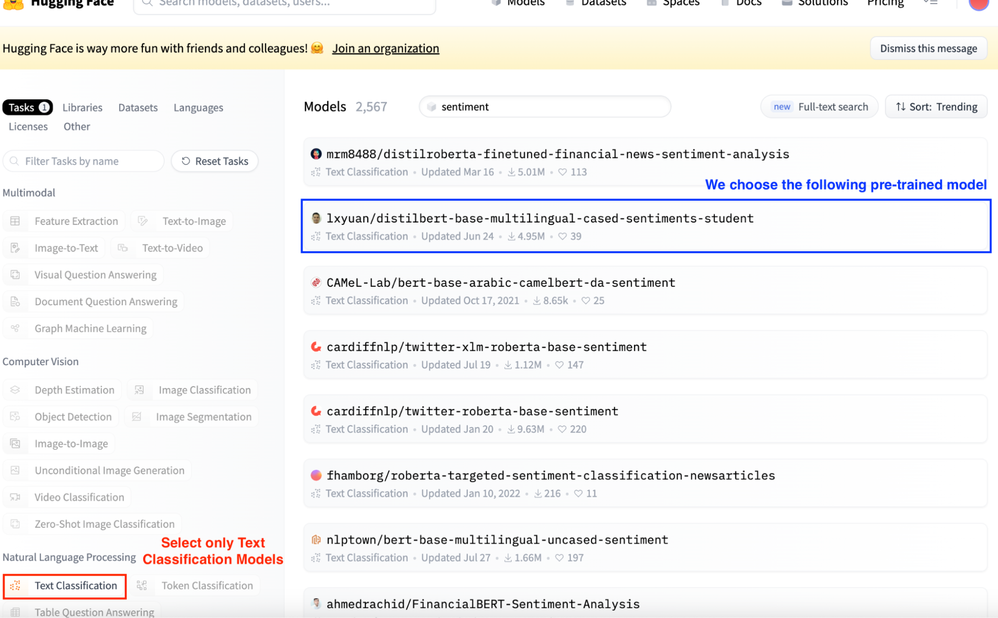 Select a model architecture suitable for your task. In this case, we want to keep using the same sentiment analysis model.