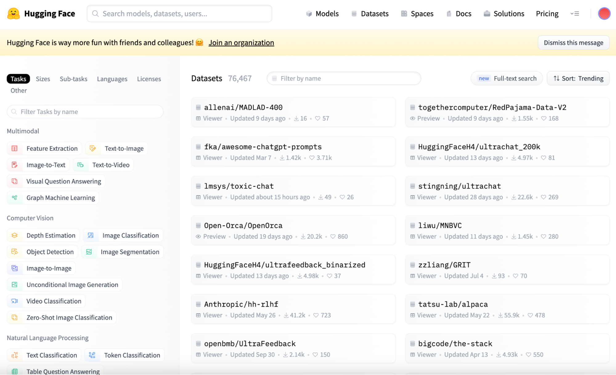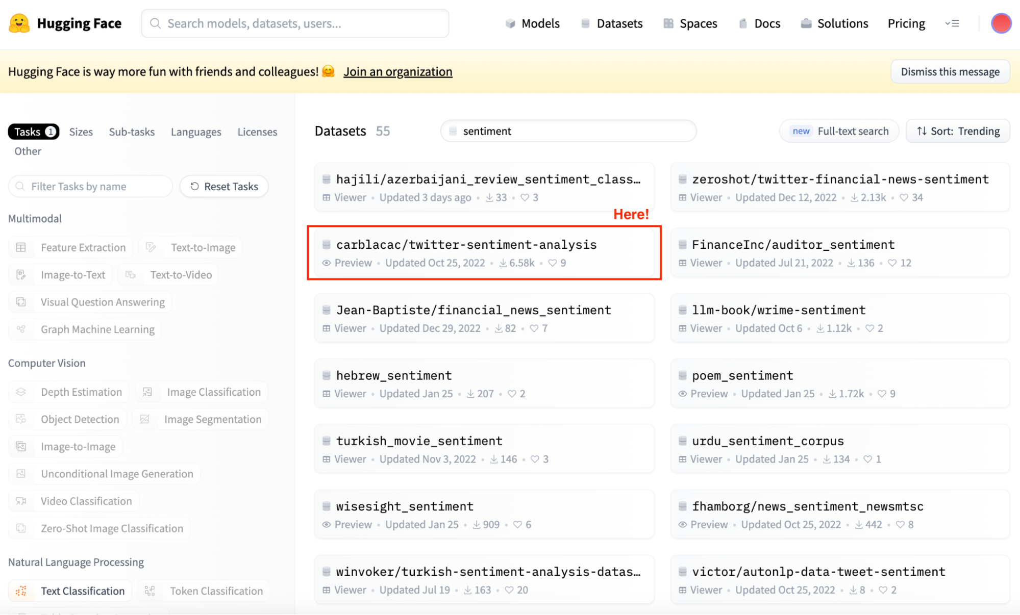 However, now we need some data to train our model. And this is precisely where the datasets library kicks in. We can go check all datasets in the Model Hub, and find the one that fits us the best.