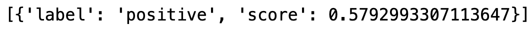 In this instance, the input string has been classified with the âPositiveâ label (using a sentiment analysis model), achieving a confidence score of 0.579. This score reflects the modelâs certainty in its classification.